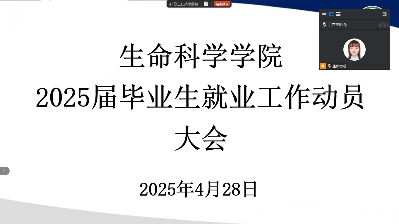 为了促进毕业年级学生顺利毕业,解决就业工作问题,生命科学学院于2025年4月28日在腾讯会议召开促就业专项会议。会议由学院党委副书记宋国东主持,学院2025届本科生辅导员孙萌、宋佳,2025届研究生辅导员张海峰以及2025届未就业学生参加。