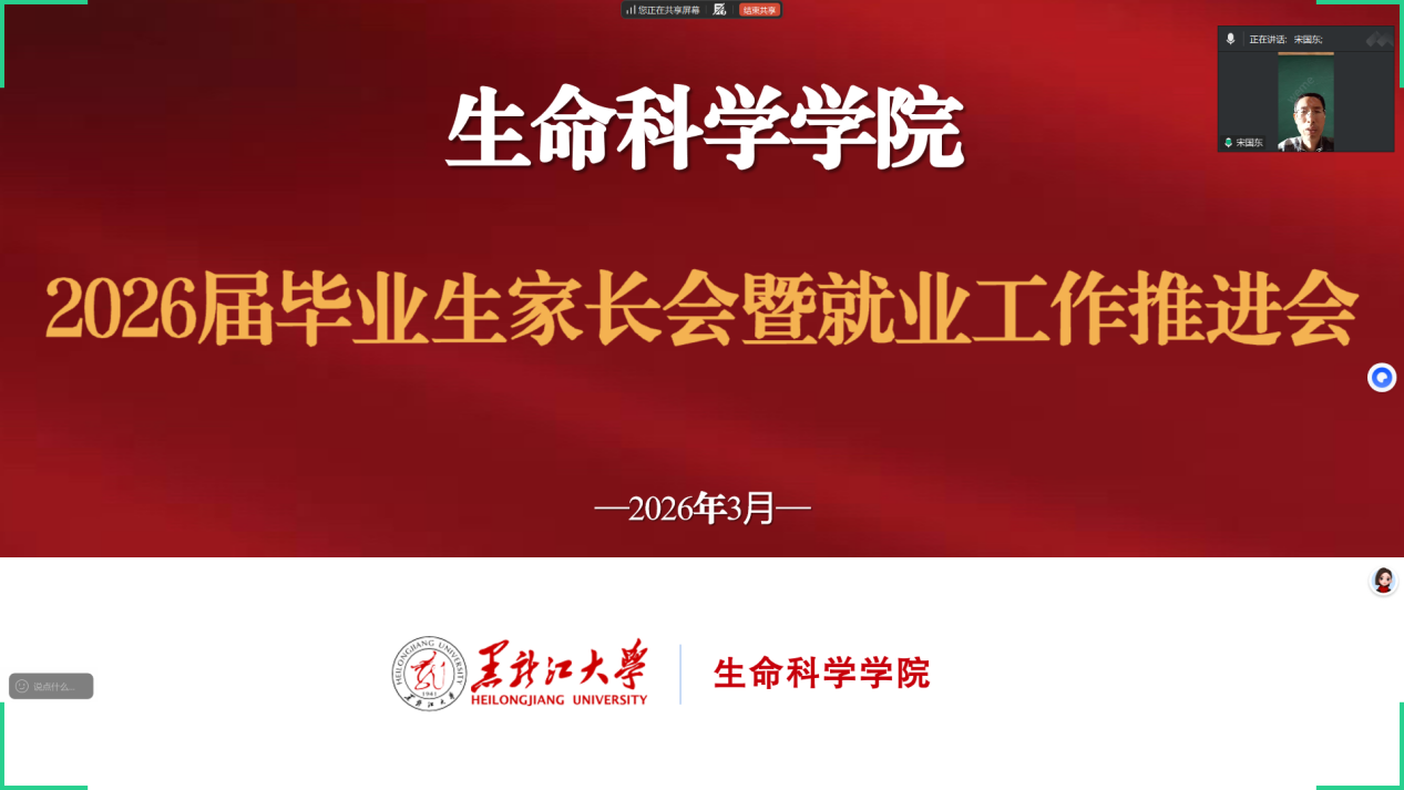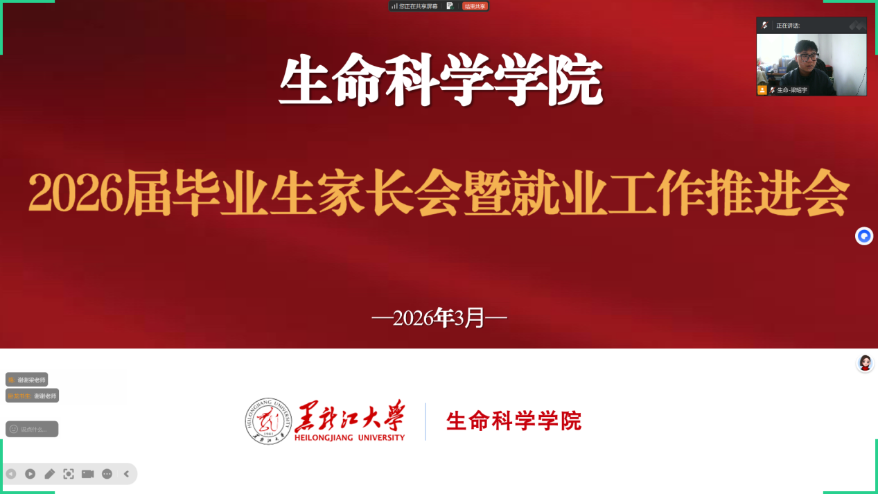为帮助2026届毕业生和家长清晰把握就业升学形势,做好毕业前关键规划,凝聚家校合力,为学生开启人生新篇章保驾护航,生命科学学院于3月20日12时召开2026届本科生毕业生家长会暨就业工作推进会。会议由2026届毕业生辅导员梁昭宇、张海峰主持,学院党委副书记宋国东出席会议,我院2026届全体毕业生及家长参加。