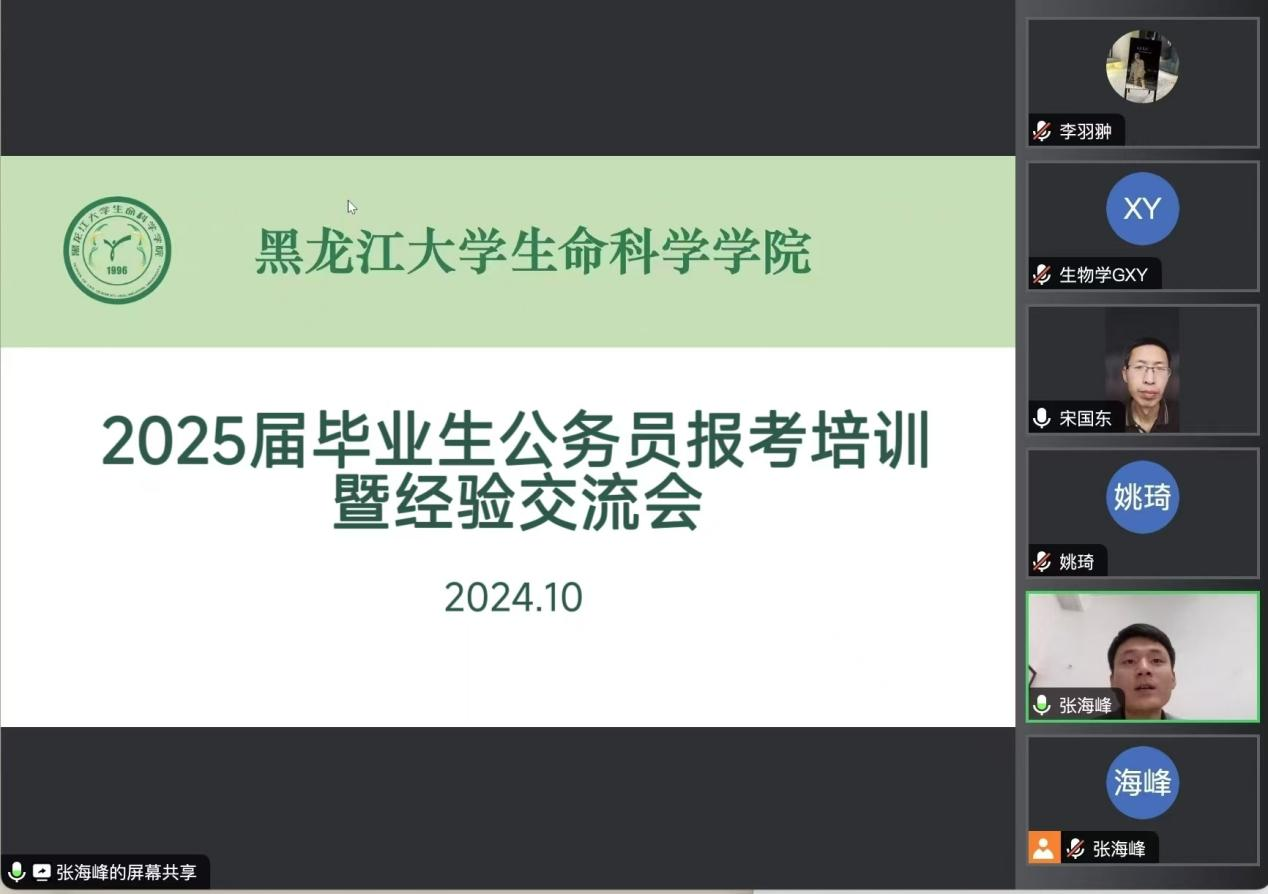 为助力2025届毕业生精准把握公务员报考方向,提升备考能力,增强就业竞争力,生命科学学院于10月17日精心组织了公务员报考培训暨经验交流会。此次活动吸引了毕业生的踊跃参与,会议由学院2025届毕业生辅导员张海峰主持。