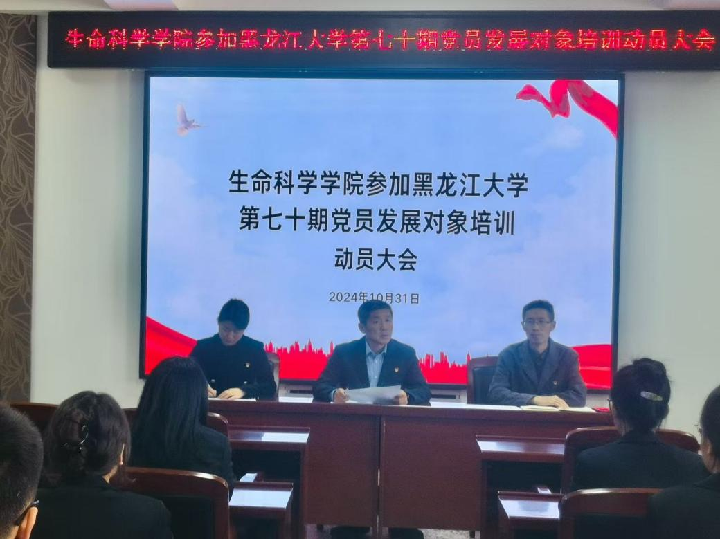为深入学习贯彻习近平新时代中国特色社会主义思想,全面贯彻落实党的二十届三中全会精神,巩固拓展主题教育成果,全面推进党纪学习教育常态化长效化,以集中教育培训和系统全面的学习,推动党员发展对象坚定拥护“两个确立”,自觉做到“两个维护”,切实筑牢“身在最北方,心向党中央”的政治忠诚。生命科学学院于10月31日12:30在生物楼614会议室召开生命科学学院参加黑龙江大学第七十期党员发展对象培训动员大会,党委书记王斌、党委副书记宋国东出席会议,2024年下半年发展对象全员参加,会议由团委书记刘明主持。