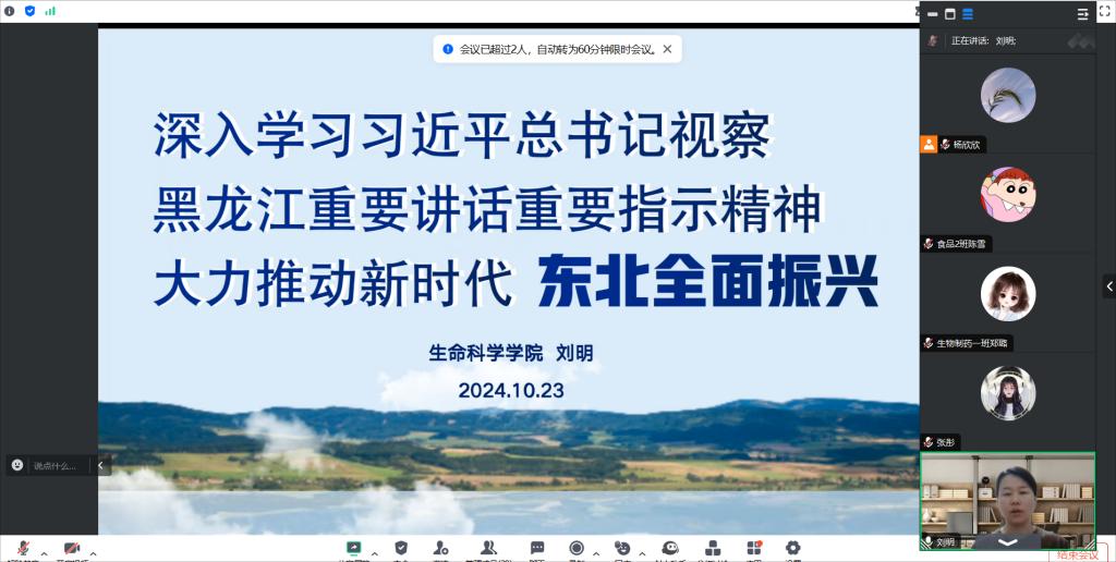 刘明老师以“深入学习习近平总书记视察黑龙江重要讲话重要指示精神大力推动新时代东北全面振兴”为主题,带领同学们认真学习了习近平总书记视察黑龙江省期间的重要讲话重要指示精神。刘明老师指出同学们要把习近平总书记的亲切关怀转化为干事创业的强大动力,把对习近平总书记的忠诚爱戴转化为推动振兴发展的生动实践。以“身在最北方,心向党中央”的政治忠诚紧跟核心,不懈奋斗。刘明老师表示,各位同学要持续深化理论武装,不断跟进学习习近平新时代中国特色社会主义思想,奋力谱写新时代黑龙江高质量发展和全面振兴新篇章,为实现龙江全面振兴全方位振兴,强国建设、民族复兴作出新的更大贡献。