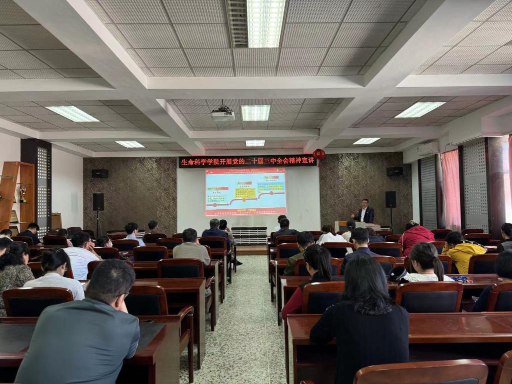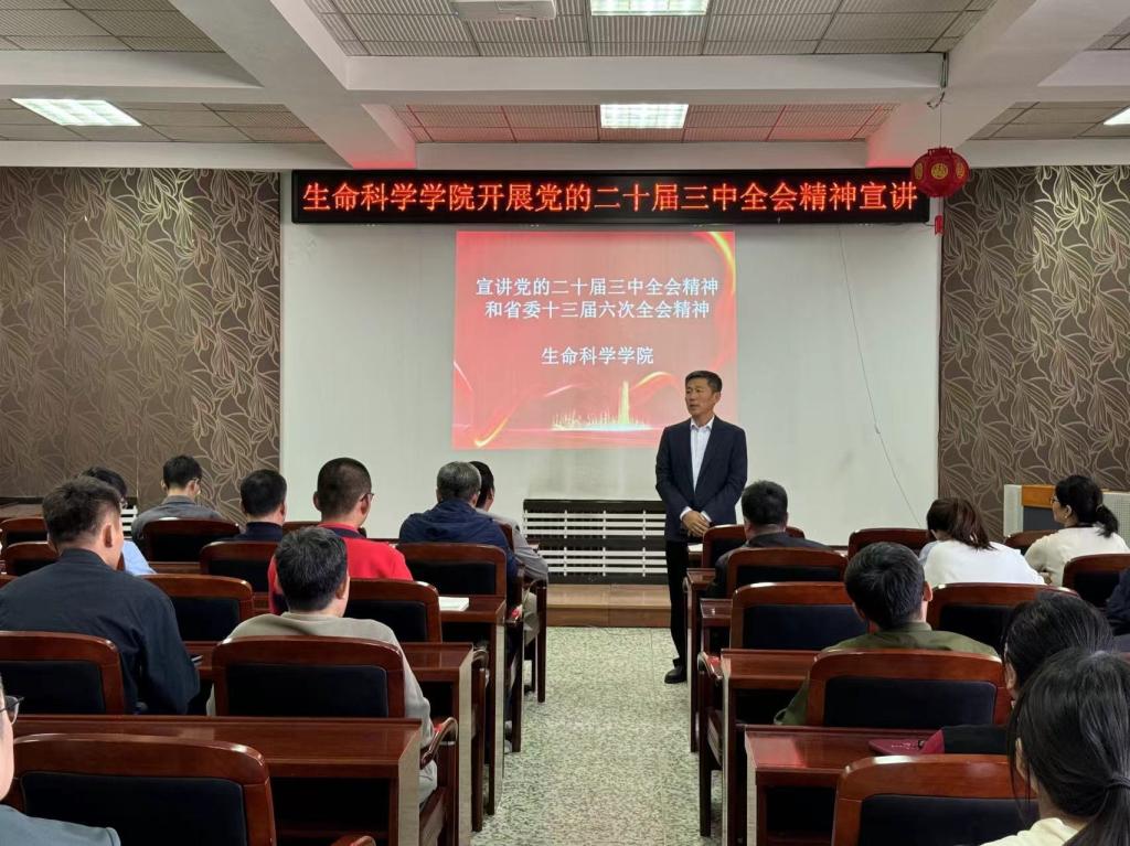 为深入学习贯彻党的二十届三中全会精神和省委十三届六次全会精神,推动会议精神在学院落地生根,见行见效,9月18日14时,生命科学学院特邀请马克思主义学院副院长文记东副教授在生物楼614会议室开展题为《进一步全面深化改革开放,为推进中国式现代化提供强大动力和制度保障》的宣讲。学院领导班子成员、党员代表、师生代表参加宣讲,会议由生命科学学院党委书记王斌主持。