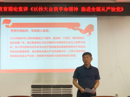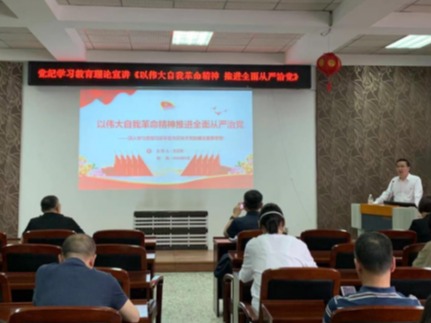 为深入学习贯彻习近平总书记关于党纪学习教育的重要讲话和重要指示精神,贯彻落实《黑龙江大学学习宣传贯彻〈中国共产党纪律处分条例〉(修订)的方案》,引导党员干部学纪、知纪、明纪、守纪,增强政治定力、纪律定力、道德定力、抵腐定力,6月11日14:00,生命科学学院在614会议室召开党纪学习教育理论宣讲会。马克思主义学院副院长文记东作《以伟大自我革命精神 推进全面从严治党》主题宣讲。生命科学学院全体教职工参加本次宣讲,会议由党委书记王斌主持。