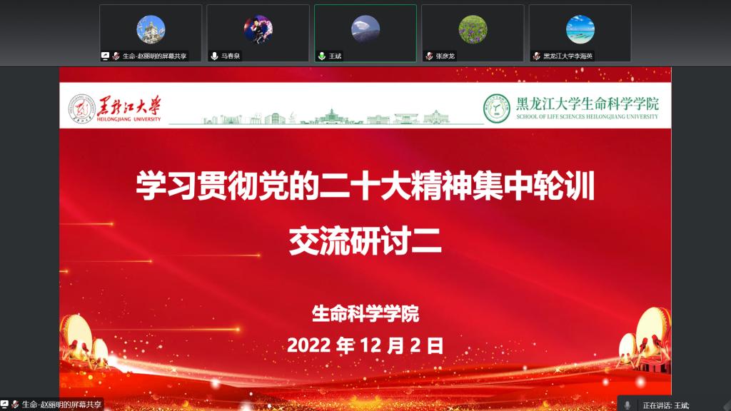 12月2日交流研讨会上,王斌做题为“学习党的二十大精神 落实立德树人根本任务”交流发言,李海英做题为“深化生态文明建设 抓住机遇与挑战 积极进行生态学学科的一体化建设”交流发言,张彦龙做题为“从党的二十大报告看新征程之新亮点”交流发言,马春泉做题为“中国式现代化进程为中国高等教育发展提供了新的发展契机”交流发言。王斌总结强调,班子成员要结合能力作风建设年“解放思想 振兴发展”大讨论,从各自分工角度,进一步深入研究分析具体工作,把党的二十大精神有机融入学院各方面工作。