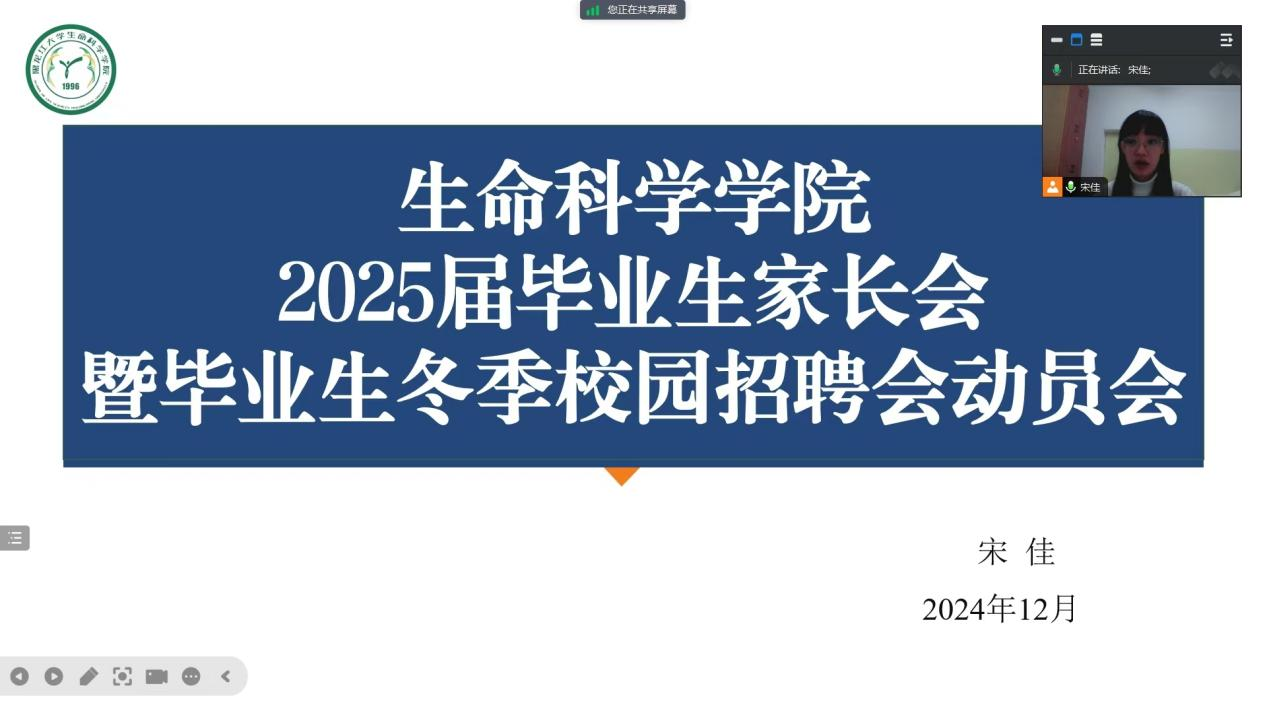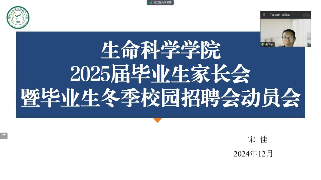 为进一步加强家校协作,凝聚育人合力,共同推进2025届毕业生就业工作,生命科学学院于12月22日召开了2025届毕业生家长会暨就业推进会。学院党委副书记宋国东出席本次会议,2025届毕业生及家长参加,会议由2025届毕业生辅导员宋佳主持,共同聚焦学生就业这一核心议题,携手为毕业生的未来发展助力。