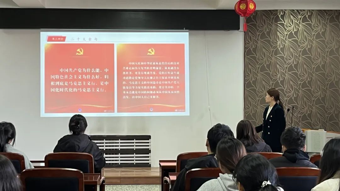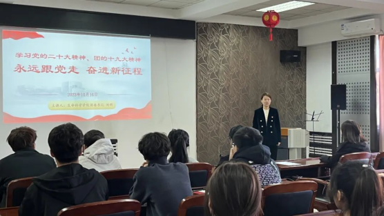 对于党的相关理论知识的学习,旨在增强学生精神动力,深刻理解党的指导思想,增强政治素养。不忘初心,牢记使命。作为当代青年人要深刻理解党的指导思想,明确思想的深刻含义,才能同舟共济,共同走向民族复兴的伟大之路。而对于中国共产党第二十次全国代表大会金句的分享,刘明老师明确指出:我们必须坚定信念,时代呼唤着我们,人民期待着我们,唯有矢志不渝、笃行不怠,方能不负时代、不负人民。中国共产主义青年团第十九次全国代表大会也让我们深刻地感悟到当代中国青年生逢其时,重任在肩。迈向全面建设社会主义现代化国家新征程,要坚持以习近平新时代中国特色社会主义思想为指导,自信自强、守正创新,踔厉奋发、勇毅前行,以更加昂扬的姿态投身民族复兴的伟大事业。